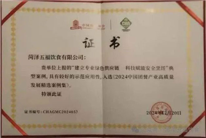 多年來,公司載譽(yù)無數(shù),先后榮獲“2016年度山東省集體配餐優(yōu)秀單位”、“2017年度中國(guó)團(tuán)餐優(yōu)秀企業(yè)”、“全國(guó)企業(yè)信用評(píng)價(jià)AAA級(jí)信用企業(yè)”、“2017年度山東團(tuán)餐優(yōu)秀企業(yè)”、“2018年度山東團(tuán)餐十大優(yōu)秀管理企業(yè)”、“2019年度山東團(tuán)餐品牌二十強(qiáng)”、“2021年度山東團(tuán)餐品牌二十強(qiáng)”、“2021年度山東團(tuán)餐食育先行單位”、“2021年度中國(guó)團(tuán)餐服務(wù)質(zhì)量?jī)?yōu)秀企業(yè)”、“2022年度中國(guó)團(tuán)餐企業(yè)TOP100”、“2022年度團(tuán)餐領(lǐng)跑者TOP300”、“2022年度山東團(tuán)餐品牌TOP20”、“2022年度中國(guó)校園餐服務(wù)質(zhì)量百?gòu)?qiáng)企業(yè)”、“2023年度山東團(tuán)餐鄉(xiāng)村振興樣板企業(yè)”、“山東知名品牌”、“2023年餐飲企業(yè)示范單位”、“2023年度團(tuán)餐領(lǐng)跑者”、“曹縣2023年度放心消費(fèi)示范單位”、“2024年度山東省食育工作先行單位”“山東省食育工作服務(wù)站”、“2024團(tuán)餐服務(wù)百?gòu)?qiáng)企業(yè)”、“2024年度山東團(tuán)餐質(zhì)量發(fā)展企業(yè)”、“2024年度團(tuán)餐企業(yè)領(lǐng)跑者TOP300”等榮譽(yù)稱號(hào)。這些榮譽(yù)不僅是對(duì)公司過往成績(jī)的肯定,更是激勵(lì)公司不斷前進(jìn)、持續(xù)提升服務(wù)品質(zhì)的動(dòng)力源泉。